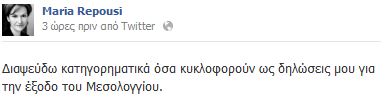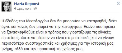 Η βουλευτής της Δημοκρατικής Αριστεράς Μαρία Ρεπούση διέψευσε μέσω της προσωπικής της σελίδας στο Facebook τα δημοσιεύματα τα οποία την ήθελαν να επιθυμεί την κατάργηση μεταξύ άλλων της…εξόδου του Μεσολογγίου, της αναπαράστασης στο Κούγκι, την ανατίναξη της Αρμάτας στις Σπέτσες γιατί τα θεωρεί “εθνικιστικά κιτς”.