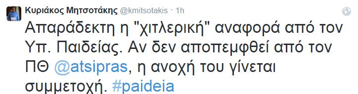 «Απαράδεκτη η “χιτλερική” αναφορά από τον Υπ. Παιδείας. Αν δεν αποπεμφθεί από τον ΠΘ, η ανοχή του γίνεται συμμετοχή».