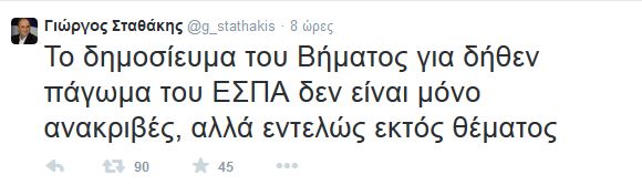 «Ανακριβές και εντελώς εκτός θέματος» χαρακτηρίζει δημοσίευμα για ενδεχόμενο πάγωμα του ΕΣΠΑ, ο υπουργός Οικονομίας, Υποδομών, Ναυτιλίας και Τουρισμού Γιώργος Σταθάκης, μέσω του προσωπικού του λογαριασμού στο Twitter.