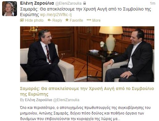 Νωρίτερα “κυκλοφόρησε” στο διαδίκτυο η πληροφορία που ήθελε τον Αντώνη Σαμαρά να δεσμεύεται απέναντι στον Μπέντζαμεν Αμπτάν ότι θα αλλάξει η σύνθεση της αντιπροσωπείας των Ελλήνων βουλευτών στο Συμβούλιο της Ευρώπης προκειμένου να αποκλειστεί η Ελένη Ζαρούλια της Χρυσής Αυγής, σύζυγος του Νίκου Μιχαλολιάκου.