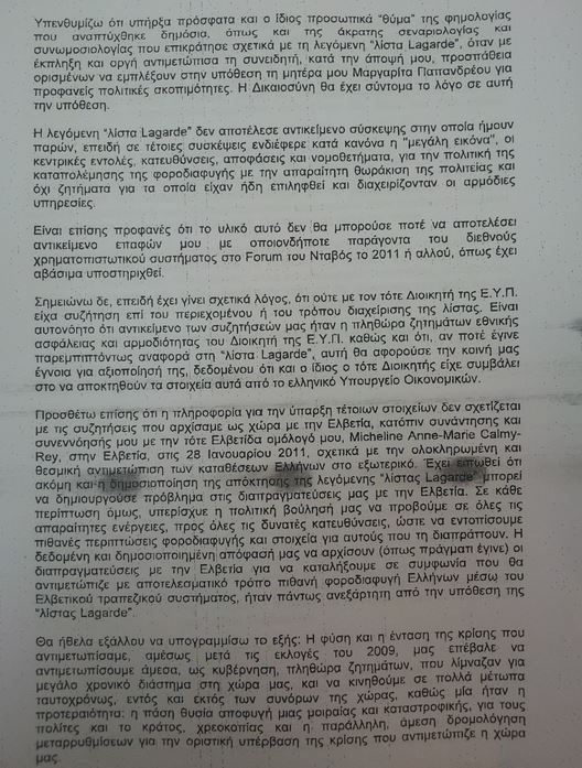 Επίσης ο Γιώργος Παπανδρέου σημειώνει ότι «δεν είχα συζήτηση με τον τότε Διοικητή της ΕΥΠ, επί του περιεχομένου ή του τρόπου διαχείρισης της λίστας».