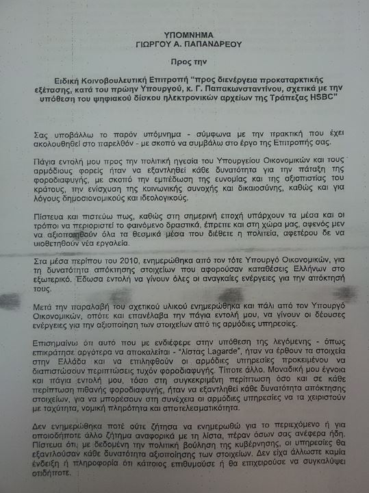 Ο κ. Παπανδρέου ξεκαθαρίζει στο υπόμνημά του ότι «περίπου στα μέσα του 2010 ενημερώθηκα από τον τότε Υπουργό Οικονομικών για τη δυνατότητα απόκτησης στοιχείων που αφορούσαν στις καταθέσεις Ελλήνων στο εξωτερικό. Έδωσα εντολή να γίνουν όλες οι αναγκαίες ενέργειες για την απόκτησή τους».
