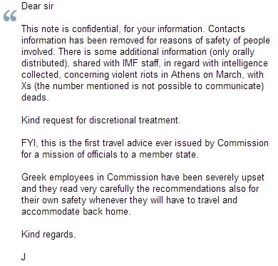 Είναι η πρώτη φορά που εκδίδει η Κομισιόν ταξιδιωτική οδηγία για κράτος μέλος της Ε.Ε. , συστήνοντας στα στελέχη της Επιτροπής που έρχονται στην Αθήνα πως να κινηθούν για την ασφάλειά τους, η οποία κινδυνεύει, σε δύο σκέλη: αναφορά σε ανησυχίες που έχουν εκφρασθεί για νεκρούς στην Ελλάδα από διαδηλώσεις, και οδηγίες θα προς τα στελέχη για το πώς θα αντεπεξέλθουν σε συνθήκες αναρχίας και συγκρούσεων, συστήνοντάς τους να μην εμφανίζουν την ιδιότητα, την εθνικότητα ή το ρόλο τους.