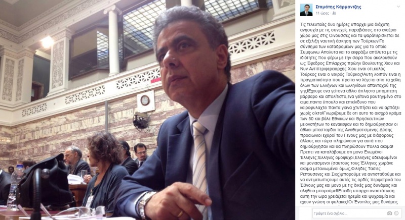 Σε διευκρινιστικές δηλώσεις προέβη σήμερα το πρωί ο αντιπεριφερειάρχης Χίου Σταμάτης Κάρμαντζης, αναφορικά με τη χθεσινή του ανάρτηση στο λογαριασμό που διατηρεί στο Facebook, και στην οποία καταφέρονταν κατά του Τουρκικού Κράτους.