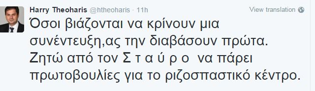 O ίδιος πάντως με το tweet του διευκρινίζει: “Όσοι βιάζονται να κρίνουν μια συνέντευξη,ας την διαβάσουν πρώτα. Ζητώ από τον Σ τ α ύ ρ ο να πάρει πρωτοβουλίες για το ριζοσπαστικό κέντρο”.