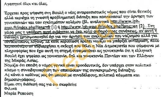 Είναι χαρακτηριστικό ότι η βουλευτής της ΔΗΜΑΡ καλεί την Επιτροπή Δικαιωμάτων του ΣΥΡΙΖΑ να παρακινήσει «συναδέλφους, πολιτικά κόμματα και δημοσιογράφους» να μην «περάσει» η -όπως τη χαρακτηρίζει- «προβληματική διάταξη που ποινικοποιεί την άρνηση των γενοκτονιών και των εγκλημάτων πολέμου»!