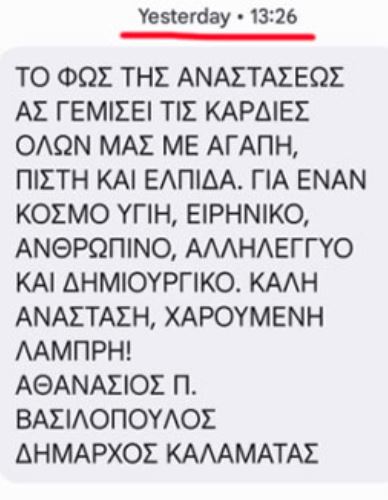 Δύο μηνύματα με… πασχαλινές ευχές έστειλε κατά λάθος μέσα σε λίγες ώρες ο Δήμαρχος Καλαμάτας, Θανάσης Βασιλόπουλος, σε πολίτες του δήμου του, με αφορμή τα εγκαίνια του εκλογικού του κέντρου που πραγματοποιήθηκαν το βράδυ της Κυριακής.