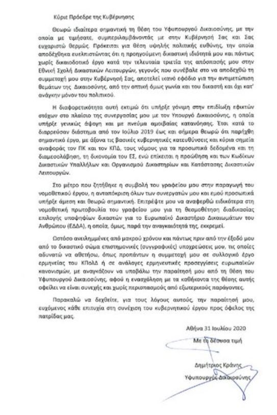 Ο Δημήτρης Κράνης, στην επιστολή παραίτησης αναφέρει μεταξύ άλλων: “ανειλημμένες από μακρού χρόνου και πάντως πριν από την έξοδό μου από το δικαστικό σώμα επιστημονικές (συγγραφικές) υποχρεώσεις μου, τις οποίες αδυνατώ να αθετήσω, όπως προπάντων η συμμετοχή μου σε συλλογικό έργο ερμηνείας του ΚΠολΔ ή ανάλογες ερμηνευτικές προσεγγίσεις ευρωπαϊκών κανονισμών, με αναγκάζουν να υποβάλω την παραίτησή μου από τη θέση του υφυπουργού Δικαιοσύνης, αφού η ενασχόληση με τα καθήκοντα της θέσης αυτής οφείλει να είναι συνεχής και χωρίς περισπασμούς από εξωτερικούς παράγοντες. Παρακαλώ να δεχθείτε, για τους λόγους αυτούς, την παραίτησή μου, ευχόμενος κάθε επιτυχία στη συνέχιση του κυβερνητικού έργου προς όφελος της πατρίδας μας”.