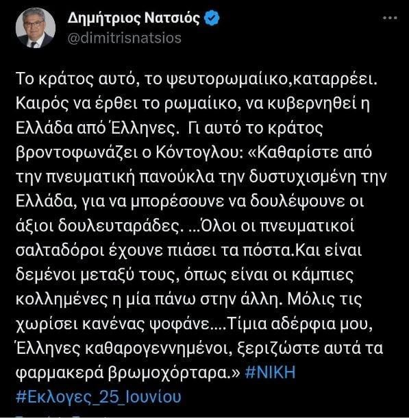 «Το κράτος αυτό, το ψευτορωμαίικο, καταρρέει. Καιρός να έρθει το ρωμαίικο, να κυβερνηθεί η Ελλάδα από Έλληνες. Γι’ αυτό το κράτος βροντοφωνάζει ο Κόντογλου: «Καθαρίστε από την πνευματική πανούκλα την δυστυχισμένη την Ελλάδα, για να μπορέσουνε να δουλέψουνε οι άξιοι δουλευταράδες. …Όλοι οι πνευματικοί σαλταδόροι έχουνε πιάσει τα πόστα. Και είναι δεμένοι μεταξύ τους, όπως είναι οι κάμπιες κολλημένες η μία πάνω στην άλλη. Μόλις τις χωρίσει κανένας ψοφάνε….Τίμια αδέρφια μου, Έλληνες καθαρογεννημένοι, ξεριζώστε αυτά τα φαρμακερά βρωμοχόρταρα.» #ΝΙΚΗ #Εκλογες_25_Ιουνίου» έγραψε ο Δημήτρης Νατσιός.