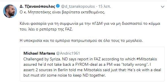 “Ο κ. Μητσοτάκης είναι βαρύτατα εκτεθειμένος. Κάνει φασαρία για τη συμφωνία με την πΓΔΜ για να μη διασπαστεί το κόμμα του, λέει ο ρεπόρτερ της FAZ” σημειώνει σε ανάρτησή του στον προσωπικό του λογαριασμό στο twitter ο κ. Τζανακόπουλος .
