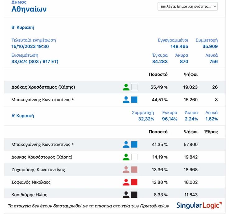 Προβάδισμα στην μάχη για τον Δήμο της Αθήνας του Χάρη Δούκα με 55,49% έναντι του Κώστα Μπακογιάννη (44,51%) στο 33,04% των ψήφων.