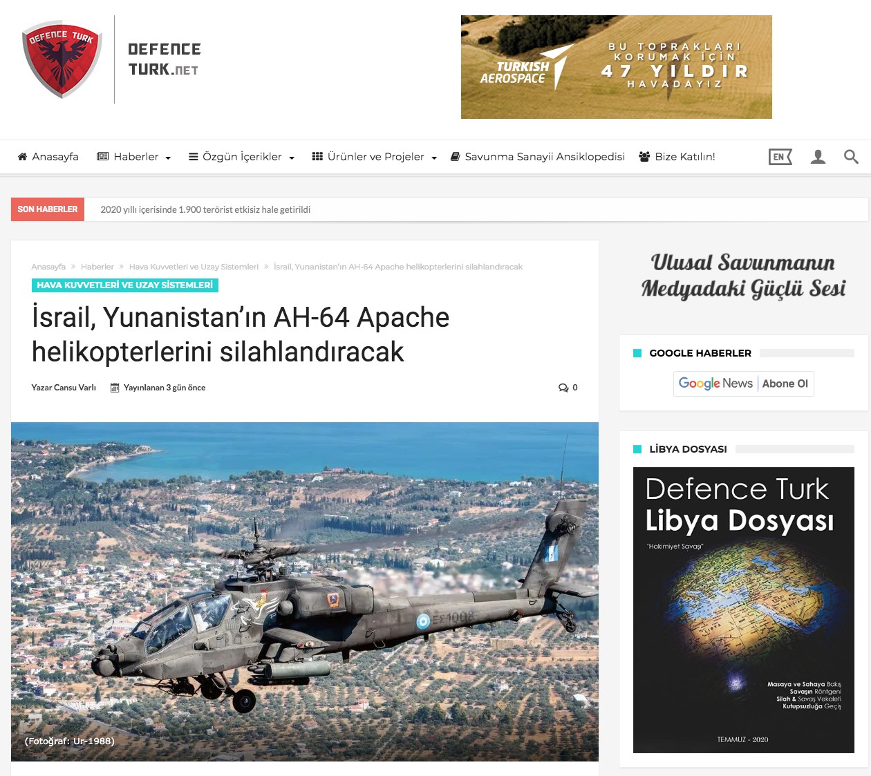 Η τουρκική ιστοσελίδα που ασχολείται με θέματα άμυνας, defenceturk αναφέρεται εκτενώς σε δημοσίευμα της στο θέμα αναβάθμισης των 19 ελικοπτέρων Apache πρώτης γενιάς που έχει η Ελλάδα, με ισραηλινά συστήματα έναντι 35 εκατ. Ευρώ.
