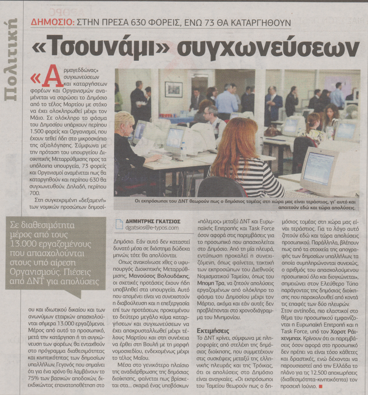 Αρμαγεδδώνας συγχωνεύσεων και καταργήσεων φορέων και Οργανισμών αναμένεται να σαρώσει το Δημόσιο, σύμφωνα με ρεπορτάζ της εφημερίδας “Ελεύθερος Τύπος”, από το τέλος Μαρτίου με στόχο να έχει ολοκληρωθεί μέχρι τον Μάιο.