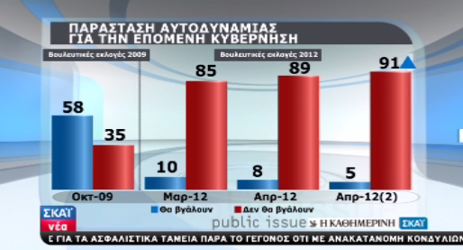 Αναφορικά με την παράσταση αυτοδυναμίας, τον Οκτώβριο του 2009 το 58% εκτιμούσε ότι θα υπάρξει αυτοδυναμία ενώ στο β’ δεκαπενθήμερο του Απριλίου του τρέχοντος έτους 91% εκτιμά ότι η αυτοδυναμία δεν είναι επιτεύξιμη.