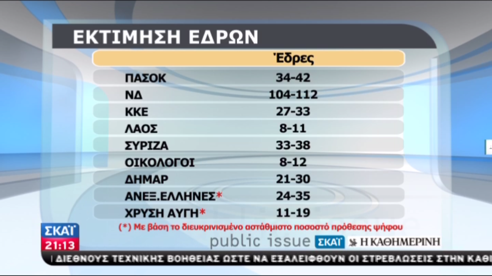 Στο 21,5% βρίσκεται το ποσοστό της Ν.Δ. και στο 14% του ΠΑΣΟΚ, σύμφωνα με την εκτίμηση επιρροής των κομμάτων που καταγράφει το τελευταίο Εκλογικό Βαρόμετρο της Public Issue για την «Καθημερινή» και το ΣΚΑΪ.Τρίτος ο ΣΥΡΙΖΑ με 13%, την τέταρτη θέση καταλαμβάνουν ΚΚΕ και Ανεξάρτητοι Έλληνες με 11%, 9,5% συγκεντρώνει η Δημοκρατική Αριστερά, 5,5% καταγράφει η Χρυσή Αυγή, 3,5% οι Οικολόγοι, 3% ο ΛΑΟΣ, 2% η Δημοκρατική Συμμαχία, 1,5% η Δράση και το ΕΠΑΜ, 1% η ΑΝΤΑΡΣΥΑ και 2% τα υπόλοιπα κόμματα. Η αποχή φτάνει το 19%. Ανοιχτό είναι το ενδεχόμενο μιας βουλής εννέα κομμάτων, καθώς σύμφωνα με την εκτίμηση εδρών ΝΔ-ΠΑΣΟΚ συγκεντρώνουν μεταξύ 138 και 154.