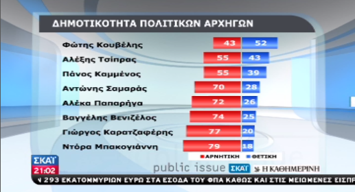Σε ότι αφορά τη δημοτικότητα των πολιτικών αρχηγών, στην κορυφή παραμένει ο Φώτης Κουβέλης, ο οποίος είναι ο μοναδικός πολιτικός με «θετικό ισοζύγιο. Ακολουθεί ο Αλέξης Τσίπρας και ο Πάνος Καμμένος.