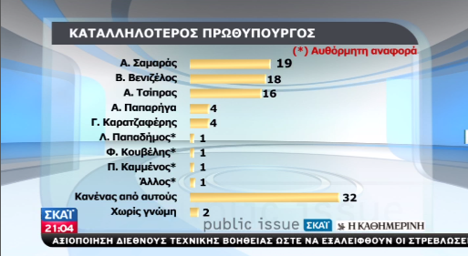 Σε ότι αφορά το ποιος είναι καταλληλότερος πρωθυπουργός προηγείται πάλι ο “κανένας”, ενώ ακολουθεί ο Αντώνης Σαμαράς και σε απόσταση αναπνοής ο Ευάγγελος Βενιζέλος.