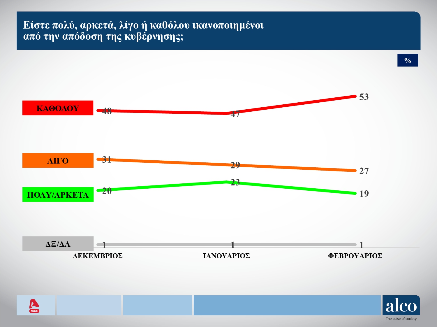 Αναφορικά με την απόδοση της κυβέρνησης, «Καθόλου ικανοποιημένοι» δηλώνουν οι πολίτες σε ποσοστό 53%. Λίγο ικανοποιημένοι, απαντά το 27%, ενώ πολύ και αρκετά ικανοποιημένοι, δηλώνουν οι ερωτηθέντες σε ποσοστό 19%.