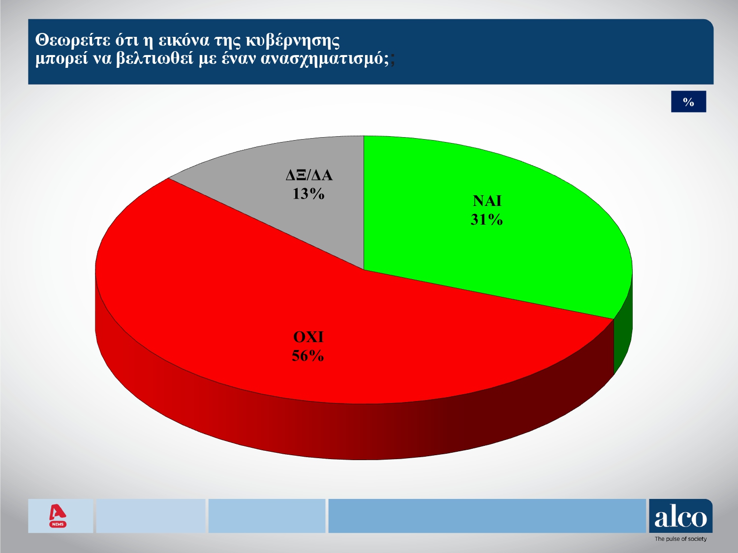 Όσον αφορά στον ανασχηματισμό ο οποίος αναμένεται να λάβει κάποια στιγμή χώρα, το 31% θεωρεί ότι θα μπορούσε να βελτιώσει την εικόνα της κυβέρνησης. Στον αντίποδα, το 56% πιστεύει πως η κυβερνητική εικόνα δεν βελτιώνεται.