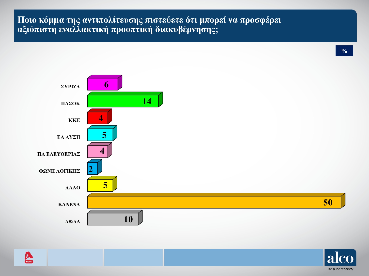 Στην ερώτηση, στο πλαίσιο μίας ενδεχόμενης πολιτικής αλλαγής, ποιο κόμμα της αντιπολίτευσης θα μπορούσε να προσφέρει αξιόπιστη εναλλακτική προοπτική διακυβέρνησης, το ΠΑΣΟΚ συγκεντρώνει το 14%, ο ΣΥΡΙΖΑ το 6%, η Ελληνική Λύση το 5%, το ΚΚΕ 4%, η Πλεύση Ελευθερίας 4% και η Φωνή Λογικής το 2%. «Κανένα κόμμα» απαντά το συντριπτικό 50%.