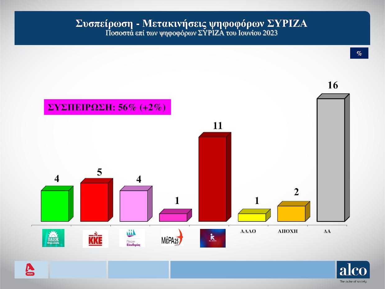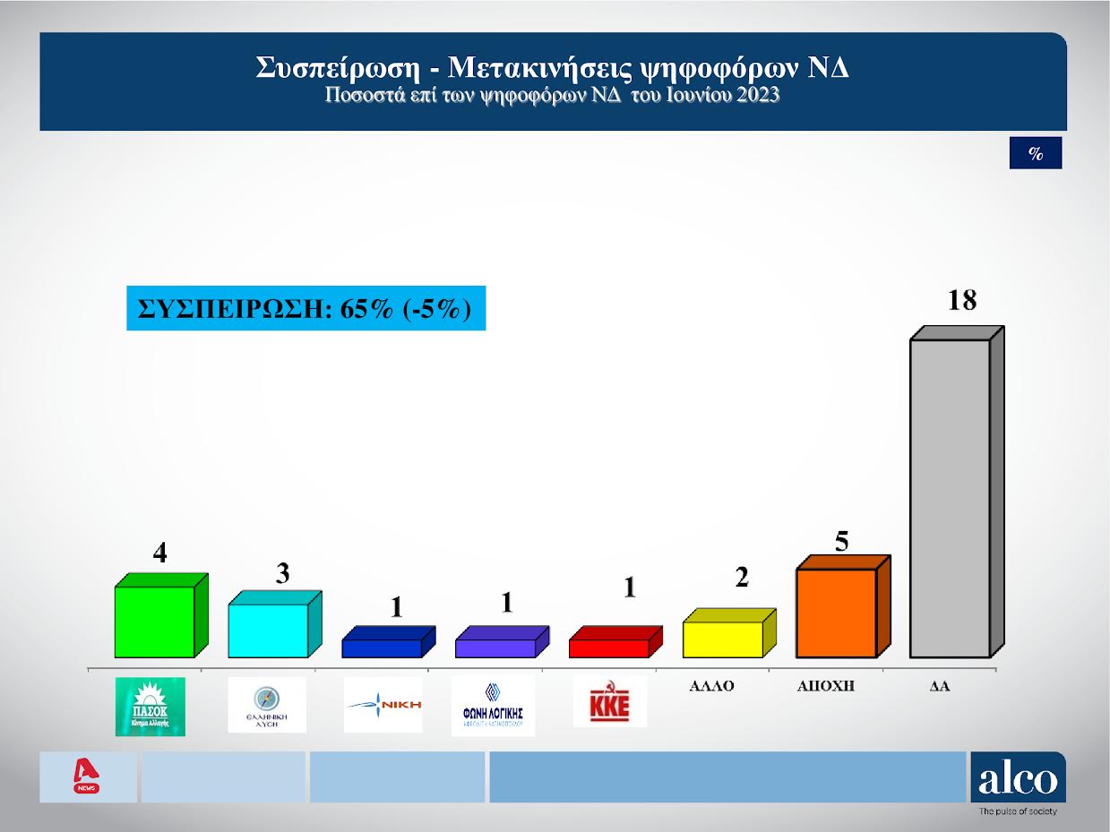 Στην ερώτηση για το τι ψήφισαν οι αναποφάσιστοι τον Ιούνιο του 2023 το 40% είχε ψηφίσει ΝΔ, τον ΣΥΡΙΖΑ το 16%, το ΠΑΣΟΚ το 8% και το 6% Σπαρτιάτες.