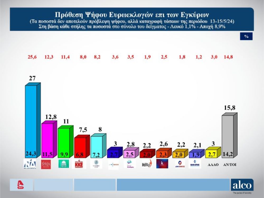 Στην πρόθεση ψήφου η Νέα Δημοκρατία προηγείται με 27% και ακολουθούν ο ΣΥΡΙΖΑ με 12,8% το ΠΑΣΟΚ με 11% και το ΚΚΕ με 7,5%. Η Ελληνική Λύση φτάνει το 8% και η ΝΙΚΗ το 3%.