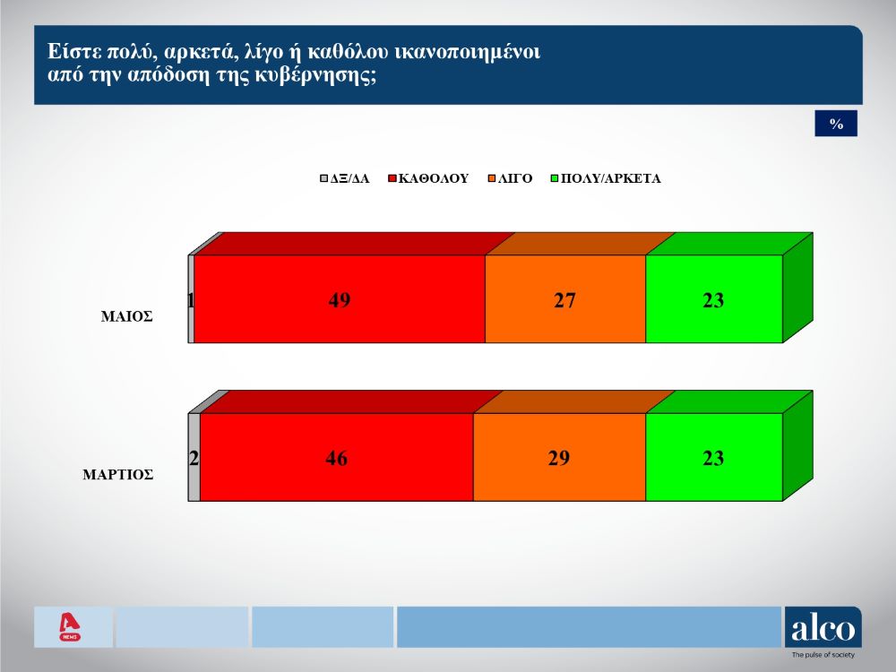 Στην ερώτηση πόσο ικανοποιημένοι είστε από την απόδοση της κυβέρνησης το 49% απαντά «καθόλου», το 27% απαντά «λίγο» και το 23% απαντά «πολύ/αρκετά».