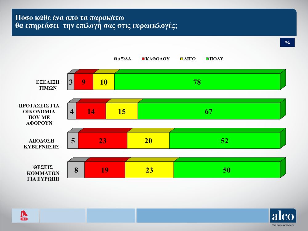Στην εν λόγω ερώτηση το78% απαντά ότι η εξέλιξη των τιμών θα επηρεάσει την ψήφο του. Το 67% απαντά ότι θα επηρεαστεί από τα οικονομικά μέτρα που τον αφορούν, το 52% απαντά «η απόδοση της κυβέρνησης» και το 50% απαντά «οι θέσεις των κομμάτων για την Ευρώπη».