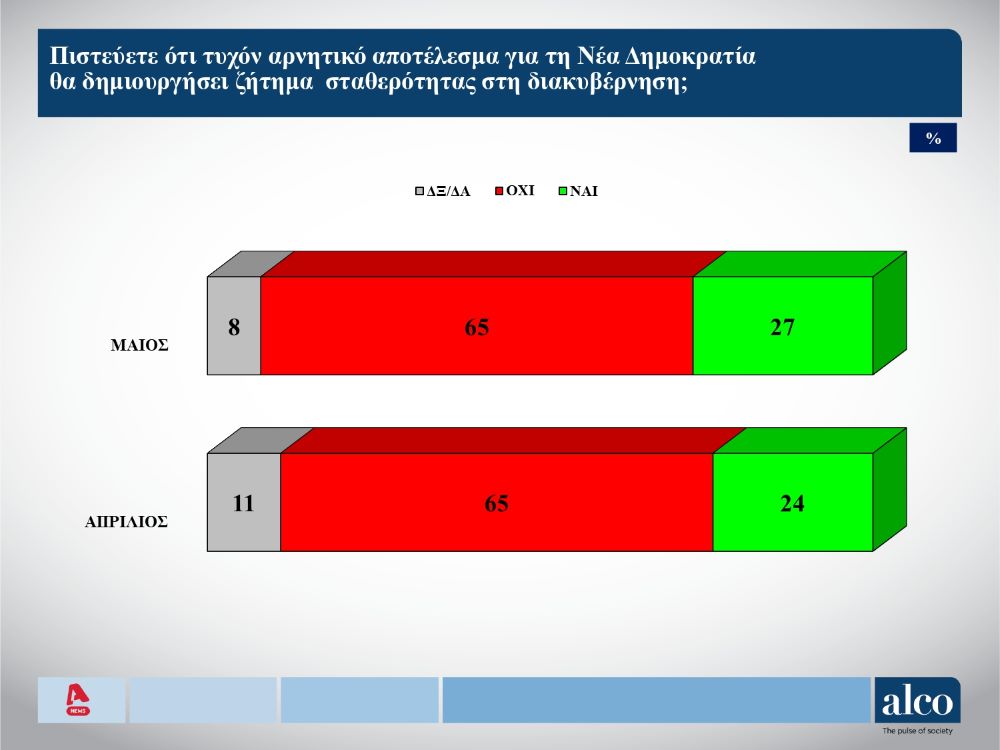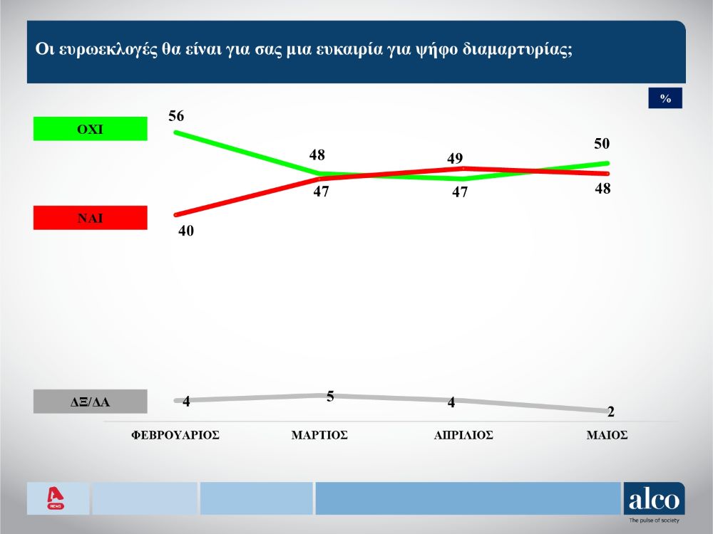 Στην ερώτηση αν οι ευρωεκλογές αποτελούν ευκαιρία για ψήφο διαμαρτυρίας το 50% απαντά «ΟΧΙ», ενώ το 48 απαντά «ΝΑΙ». Τον Φεβρουάριο τα ποσοστά ήτσαν αντιστοίχως για το «ΟΧΙ» 56% και για το «ΝΑΙ» 40%.