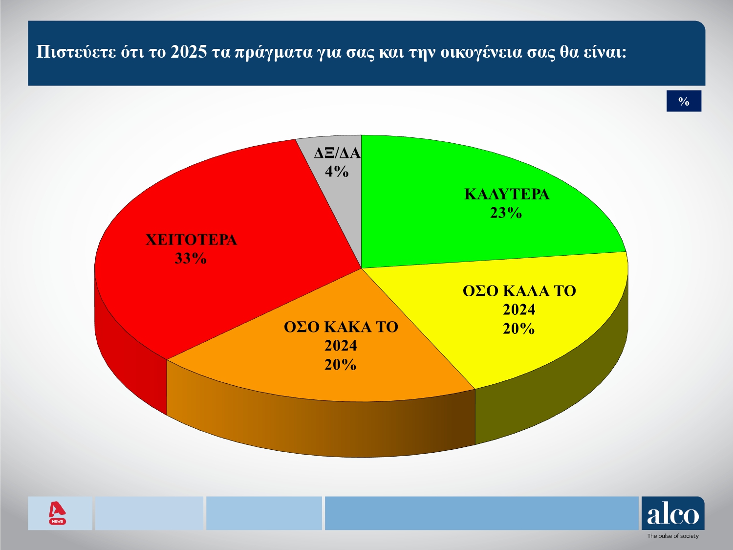 Απαισιόδοξοι για το 2025 και την κατάσταση που θα βιώνουν οι ίδιοι και οι οικογένειές τους, εμφανίζονται οι συμμετέχοντες στην έρευνα. Το 33% εκτιμά ότι τα πράγματα θα είναι χειρότερα, ενώ το 20% ότι θα είναι όσο κακά το 2024.