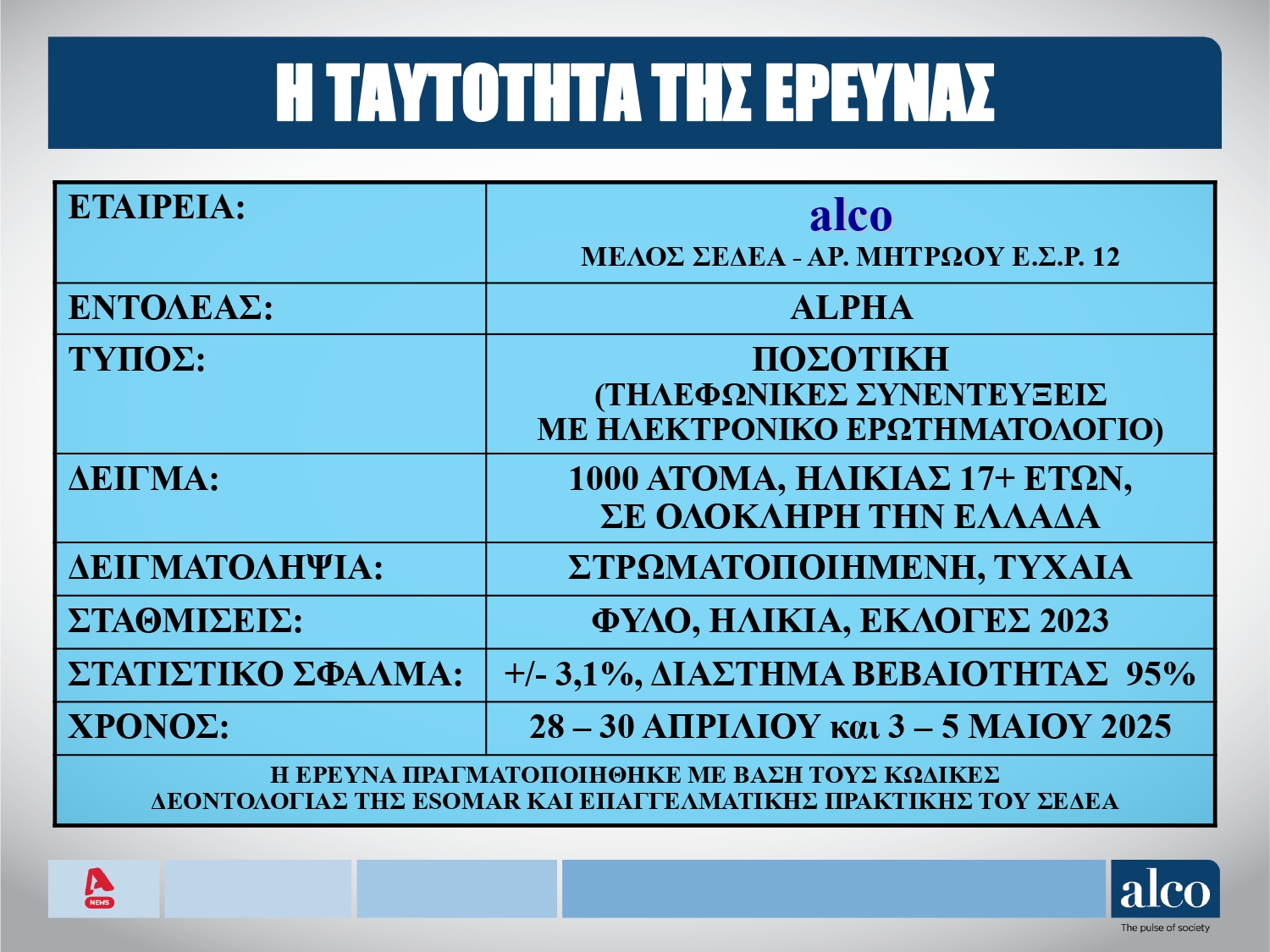 Προβάδισμα 13,1 μονάδων της Νέας Δημοκρατίας έναντι της Πλεύσης Ελευθερίας καταγράφει το πρώτο μέρος της δημοσκόπησης της Alco που παρουσιάστηκε στο κεντρικό δελτίο ειδήσεων του Alpha. Η έρευνα έγινε σε δείγμα 1000 ατόμων τα διαστήματα 28-30 Απριλίου 2025 και 3-5 Μαΐου 2025.