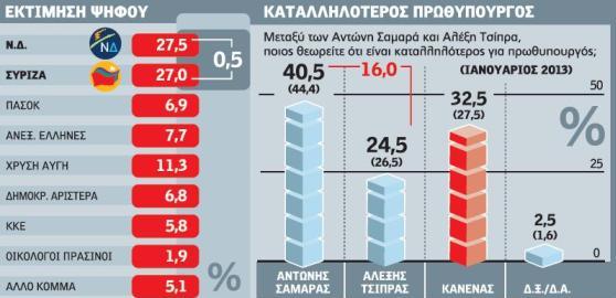 Η «ψαλίδα» έκλεισε και στη διαφορά της παράστασης νίκης στο 2,6% από το 4,8% (Ιανουάριος 2013). Τόσο ο Αντ. Σαμαράς, όσο και ο Αλέξης Τσίπρας εμφανίζονται με μειωμένα ποσοστά ως προς το ποιος είναι κατάλληλος για πρωθυπουργός, με τον αρχηγό της Ν.Δ. να προηγείται κατά 16 εκατοστιαίες μονάδες (40,5% έναντι 24,5% του Αλ. Τσίπρα).