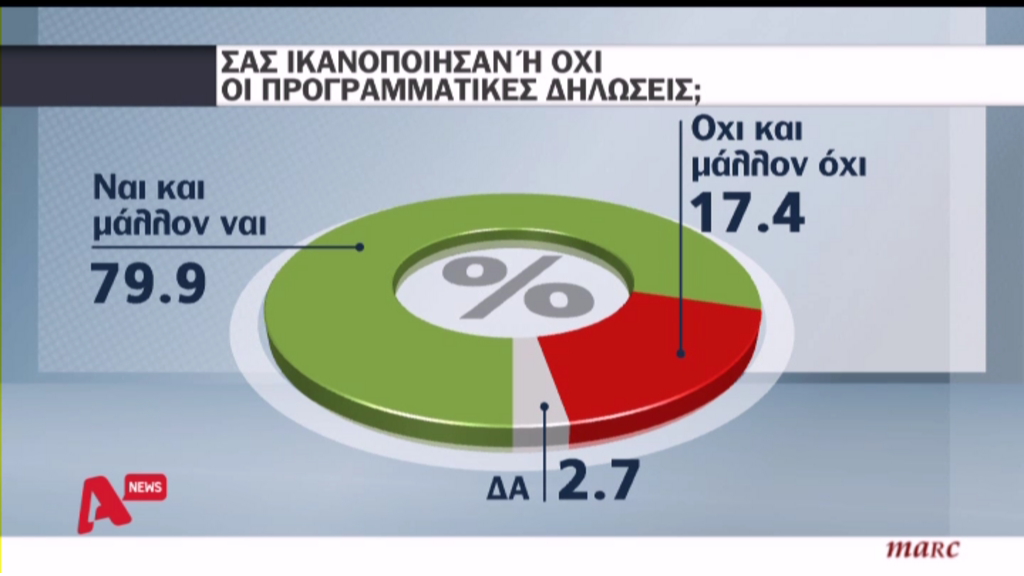 Επίσης, το 79,9% κρίνει θετικά τις προγραμματικές δηλώσεις της κυβέρνησης και το 17,4% αρνητικά.