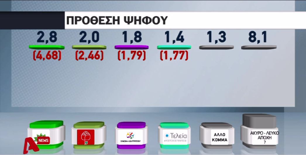 Συγκεκριμένα, στην πρόθεση ψήφου ο ΣΥΡΙΖΑ συγκεντρώνει το 45,4 %, έναντι 18,4% της Νέας Δημοκρατίας. Στην τρίτη θέση το ΚΚΕ με 4,8% και ακολουθούν οι Ανεξάρτητοι Έλληνες και η Χρυσή Αυγή με 4,7%, το Ποτάμι με 4,6%, το ΠΑΣΟΚ με 2,8%, το Κίνημα Δημοκρατών Σοσιαλιστών με 2%, η Ένωση Κεντρώων με 1,8% και η Τελεία με 1,3%.