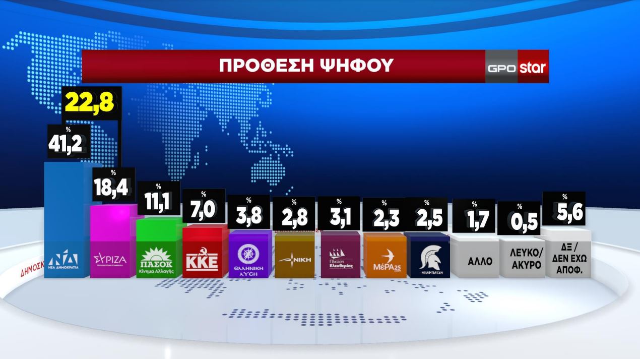 Αναλυτικά, στην πρόθεση ψήφου η Νέα Δημοκρατία συγκεντρώνει ποσοστό 41,2% και διατηρεί προβάδισμα 22,8 μονάδων έναντι του ΣΥΡΙΖΑ, που συγκεντρώνει 18,4%.