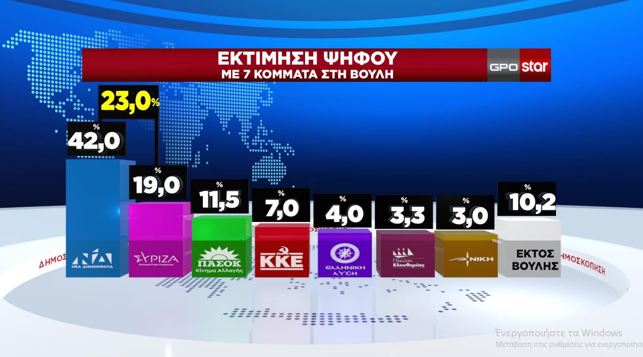 Σύμφωνα με την δημοσκόπηση, στην εκτίμηση ψήφου η ΝΔ φθάνει στο 42% με προβάδισμα 23 μονάδων έναντι του ΣΥΡΙΖΑ, που συγκεντρώνει 19%.