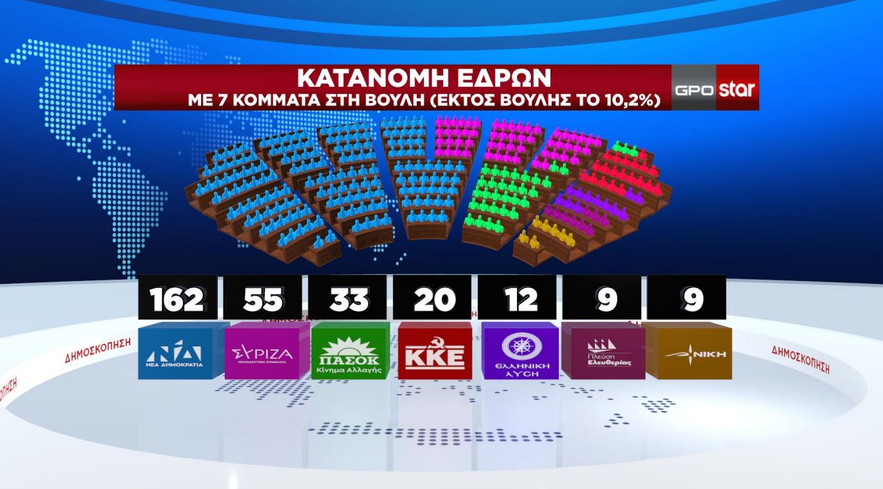Με βάση την εκτίμηση ψήφου, η Νέα Δημοκρατία λαμβάνει 162 έδρες, ο ΣΥΡΙΖΑ 55, το ΠΑΣΟΚ – Κίνημα Αλλαγής 33, το ΚΚΕ 20, η Ελληνική Λύση 12, η Πλεύση Ελευθερίας και η Νίκη από 9 έδρες.