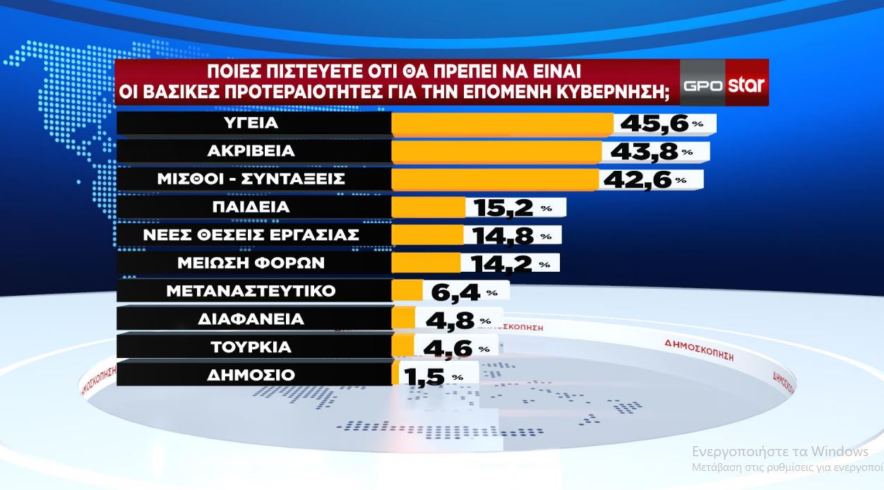 Η αντιμετώπιση των προβλημάτων του ΕΣΥ και του κύματος ακρίβειας στην αγορά, μαζί με τις αυξήσεις σε μισθούς και συντάξεις, είναι για τους πολίτες οι τρεις πρώτες προτεραιότητες που θα πρέπει να έχει η επόμενη κυβέρνηση.