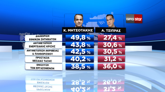 Σχετικά με την απήχηση στους ερωτώμενους των όσων αναγγέλθηκαν ανά τομείς, τα δυνατά «χαρτιά» του Κ. Μητσοτάκη έναντι του προέδρου του ΣΥΡΙΖΑ φαίνεται να είναι η διαχείριση των εθνικών ζητημάτων με 49,8% θετικές γνώμες (έναντι 27.4% για τον Αλέξη Τσίπρα στον ίδιο τομέα), για να ακολουθήσουν αντιμετώπιση της ενεργειακής κρίσης (43,8% έναντι 30,6% για Α. Τσίπρα), αντιμετώπιση ακρίβειας και πληθωρισμού (42,5% έναντι 30,5% για Α. Τσίπρα), προστασία μεσαίας τάξης (40,2% έναντι 31,2% για Α. Τσίπρα). Μικρή είναι η «ψαλίδα» στο ζήτημα της ενίσχυσης των εργαζομένων (38,5% για Μητσοτάκη έναντι 36,0% για Α. Τσίπρα).