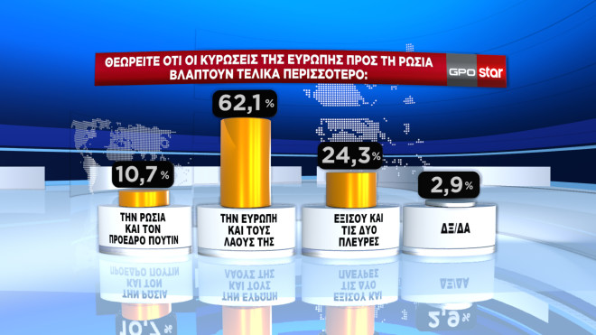 Σχετικά με τον ποιον βλάπτουν περισσότερο οι κυρώσεις στη Ρωσία, οι ερωτώμενοι στη δημοσκόπηση της GPO απαντούν στη μεγάλη πλειοψηφία τους (62,1%) ότι βλάπτουν περισσότερο την Ευρώπη και τους λαούς της. «Εξίσου και τις δύο πλευρές» απαντά το 24,3%, ενώ μόνο το 10,7% πιστεύει ότι βλάπτουν τη Ρωσία και τον Πούτιν.