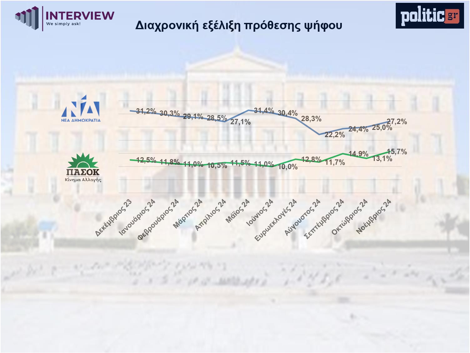 Ανοδική τροχιά καταγράφουν η Νέα Δημοκρατία και το ΠΑΣΟΚ καθώς  σύμφωνα με τα αποτελέσματα της νέας δημοσκόπησης της Interview για λογαριασμό της POLITIC, παρουσιάζουν αύξηση  στα ποσοστά τους σε σχέση με τη μέτρηση του Οκτωβρίου.