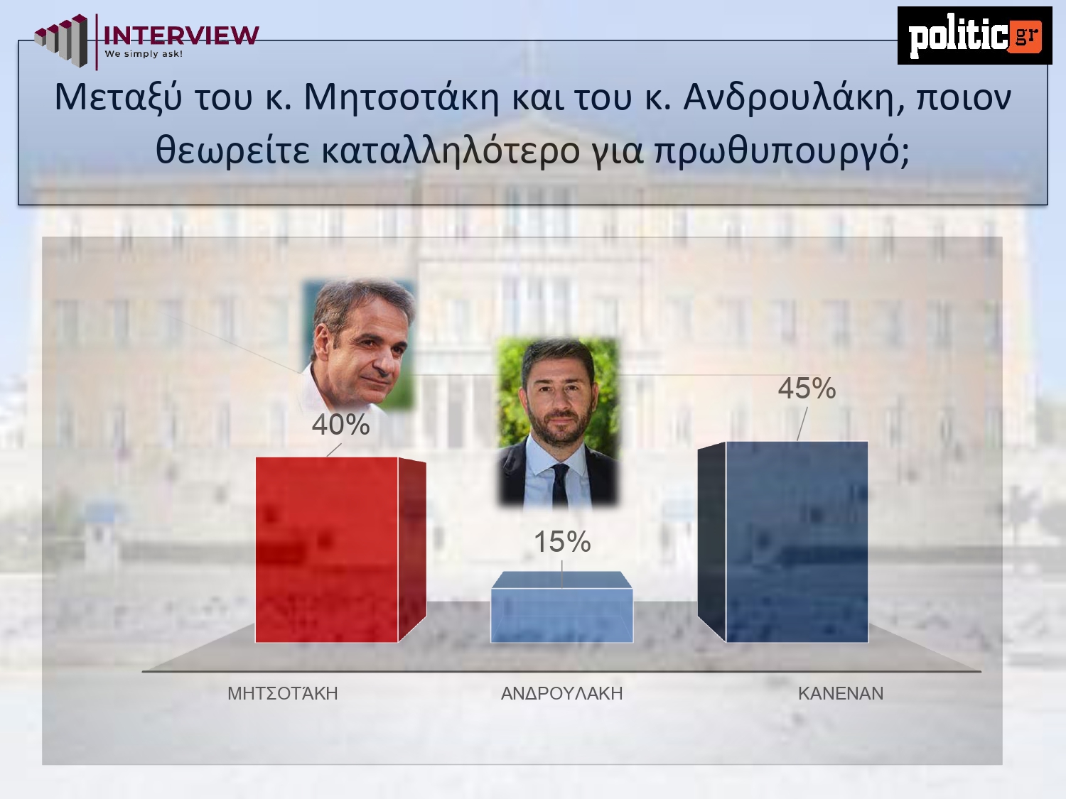 Στην καταλληλότητα πρωθυπουργού ο «Κανένας» (45%) είναι πρώτος σε σχέση με τους προέδρους των δύο πρώτων κομμάτων. Ο Μητσοτάκης είναι στο 40% και ο Ανδρουλάκης αρκετά χαμηλότερα στο 15%. Ο πρόεδρος του ΠΑΣΟΚ ο οποίος επανεπιβεβαίωσε την εμπιστοσύνη του κόμματός του προς το πρόσωπό του μέσα από τις εσωκομματικές εκλογές και έβγαλε εκτός κούρσας τον Χάρη Δούκα, φαίνεται πως πρέπει να αναδομήσει το «πρωθυπουργικό» του προφίλ.