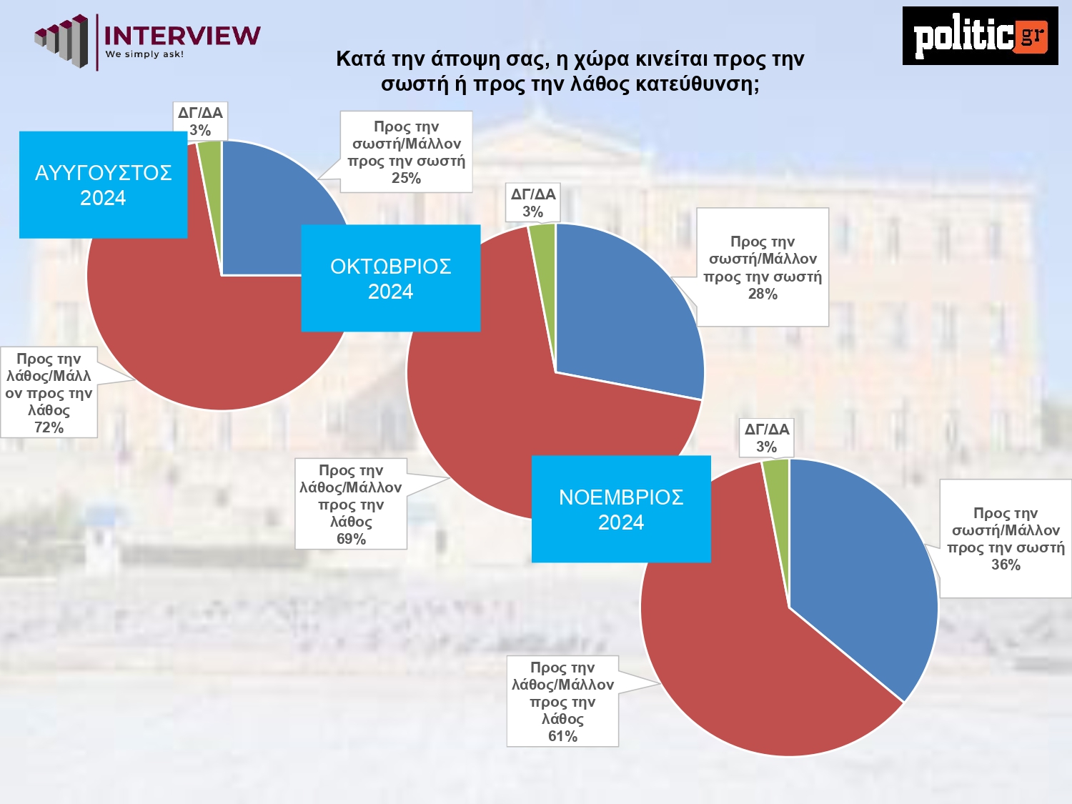 Ωστόσο, υπάρχει μια τάση αισιοδοξίας όσον αφορά την πορεία της χώρας. Αν και οι περισσότεροι θεωρούν πως η χώρα κινείται προς τη λάθος κατεύθυνση (61%), σε αντίθεση με το 36% που κρίνει πως κινείται προς τη σωστή, το αντίστοιχο ποσοστό απαισιοδοξίας (72%) παρουσιάζει φθίνουσα πορεία από τον Αύγουστο, και αντίστοιχα αύξουσα τάση το ποσοστό της αισιοδοξίας (από 25% τον Αύγουστο στο 36% τον Νοέμβριο).