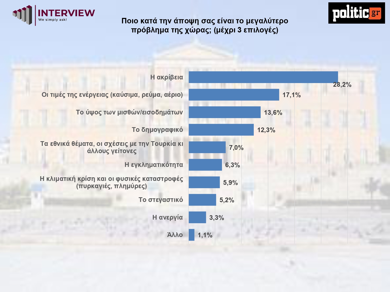 Η τρέχουσα κρίση κόστους ζωής που περιλαμβάνει την ακρίβεια, τις υψηλές τιμές της ενέργειας και τους χαμηλούς μισθούς συνεχίζουν να είναι σταθερά στην πρώτη τριάδα με τα μεγαλύτερα προβλήματα της χώρας που ταλανίζουν τους πολίτες. Την πεντάδα συμπληρώνουν το δημογραφικό και τα εθνικά θέματα.