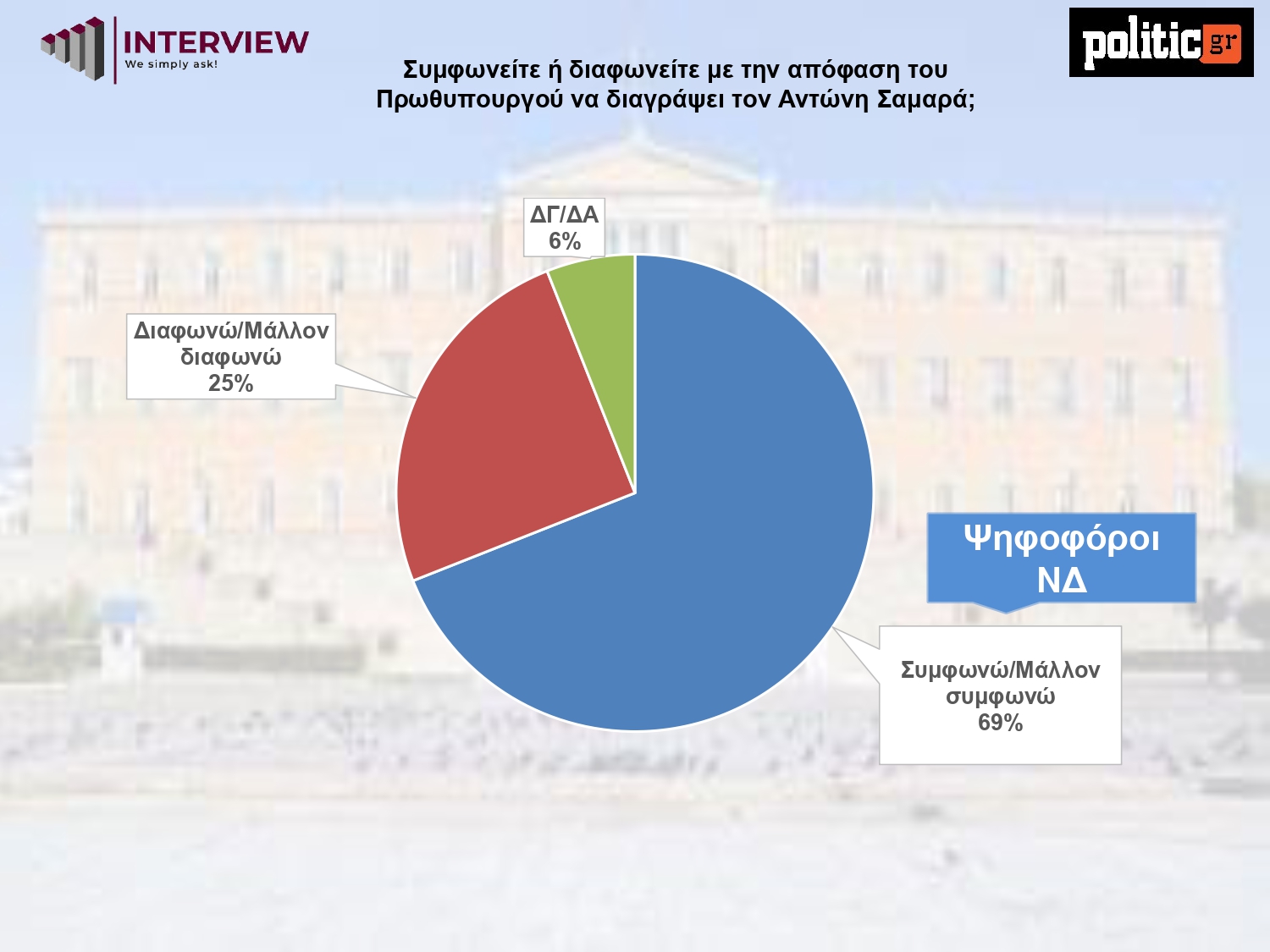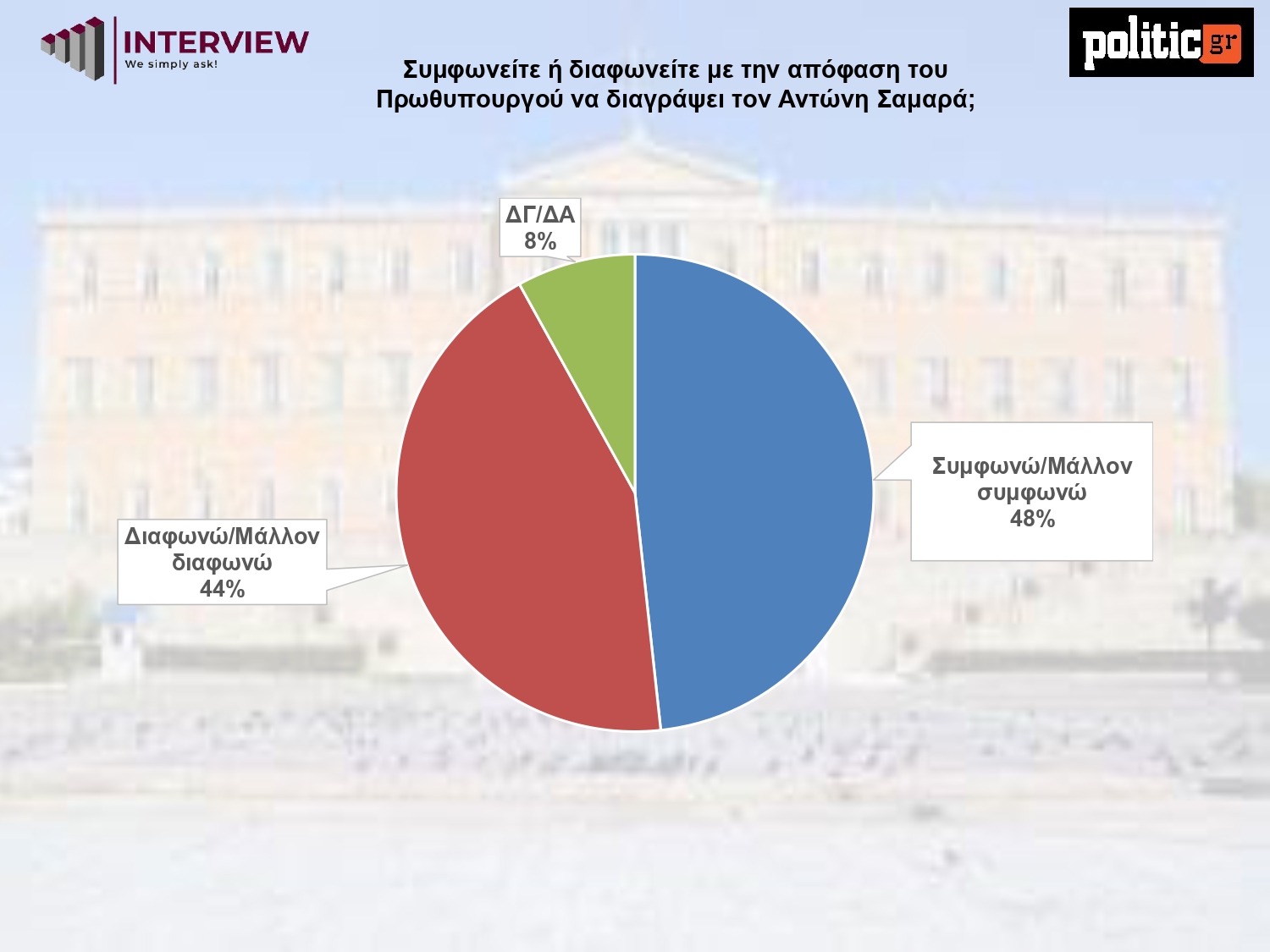 Σύμφωνα με τα αποτελέσματα της δημοσκόπησης της Interview, η διαγραφή Σαμαρά δεν έπληξε δημοσκοπικά την κυβέρνηση. Μάλιστα βγαίνει και ενισχυμένη.