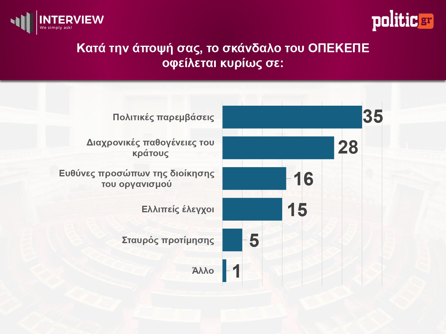 Οι πολίτες αποδίδουν την ευθύνη για το σκάνδαλο του ΟΠΕΚΕΠΕ πρωτίστως σε πολιτικές παρεμβάσεις. Συγκεκριμένα, το 35% θεωρεί ότι το ζήτημα προκύπτει από πολιτικές παρεμβάσεις, ενώ το 28% το συνδέει με διαχρονικές παθογένειες του κράτους. Ακολουθούν οι ευθύνες που αποδίδονται στη διοίκηση του οργανισμού με 16% και στους ελλιπείς ελέγχους με 15%.