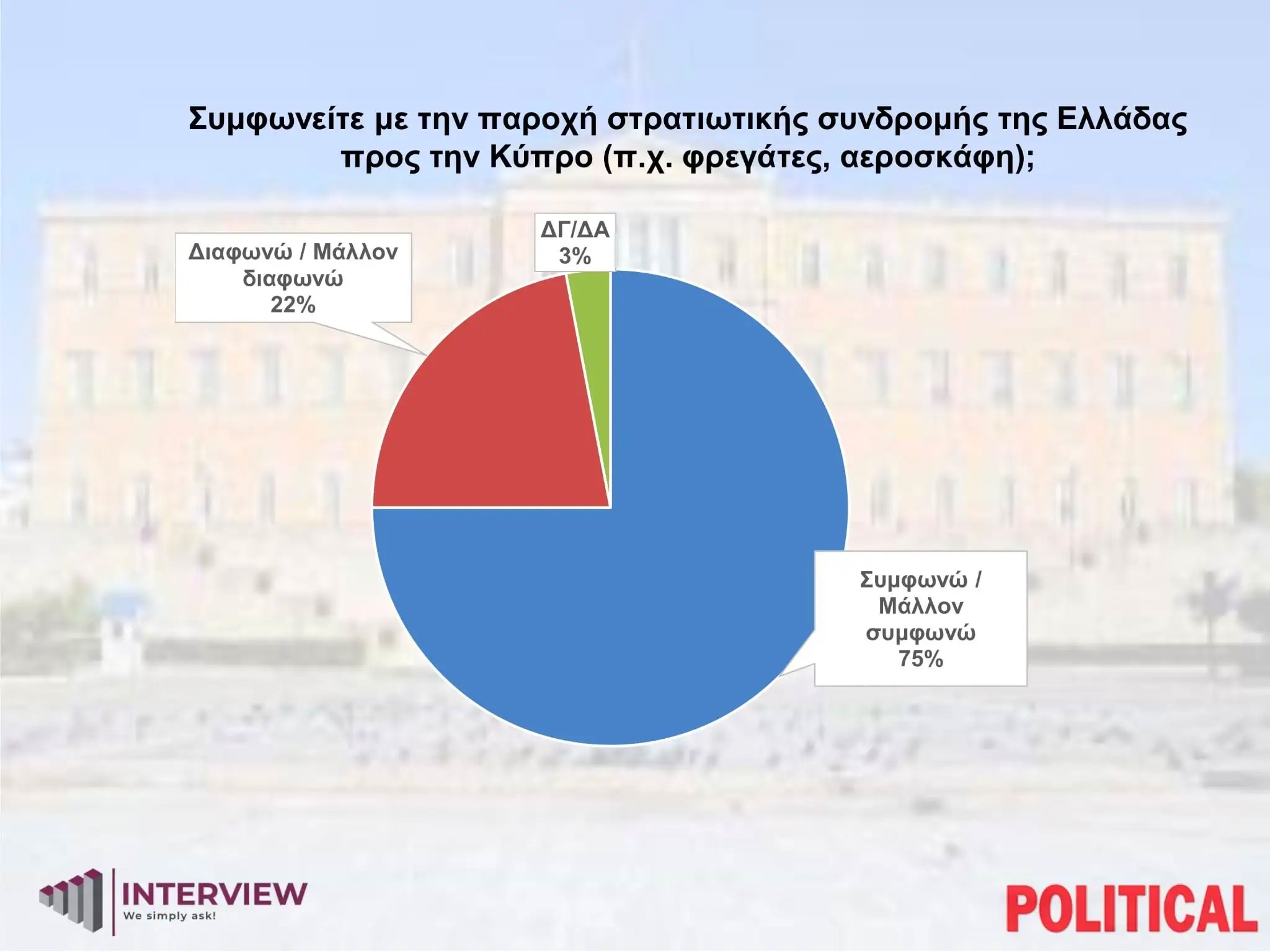 Η δημοσκόπηση καταγράφει, παράλληλα, τη στάση των πολιτών απέναντι στην απόφαση της κυβέρνησης να αποστείλει τις φρεγάτες «Κίμων» και «Ψαρά», καθώς και τέσσερα μαχητικά F-16 στην Κύπρο. Το 75% των ερωτηθέντων δηλώνει ότι «συμφωνεί ή μάλλον συμφωνεί» με την απόφαση, ενώ το 22% απαντά ότι «διαφωνεί ή μάλλον διαφωνεί»