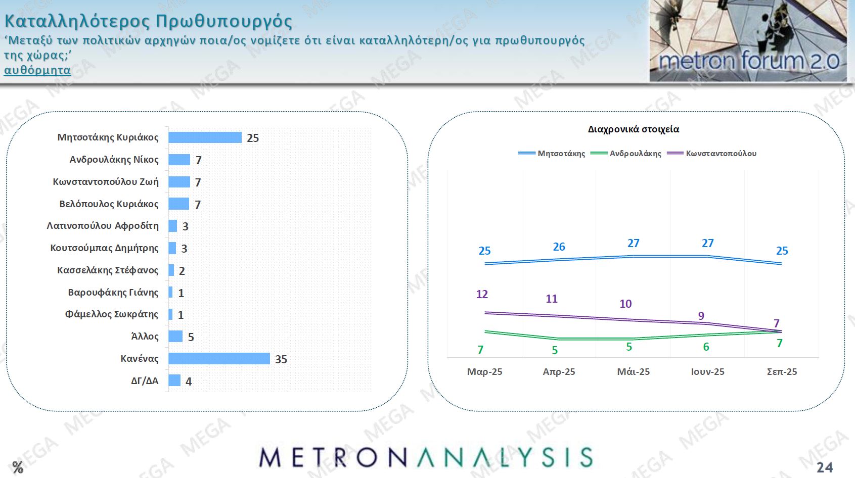 Στην ερώτηση για το ποιος είναι ο καταλληλότερος πρωθυπουργός ο Κυριάκος Μητσοτάκης είναι μπροστά με 25% σε μεγάλη απόσταση από τον δεύτερο Νίκο Ανδρουλάκη στο 7%, όμως αρκετά πίσω από τον «Κανένα» που με 35% αποτελεί την καλύτερη συμπύκνωση της έλλειψης εμπιστοσύνης των πολιτών απέναντι στο υπαρκτό πολιτικό σύστημα.
