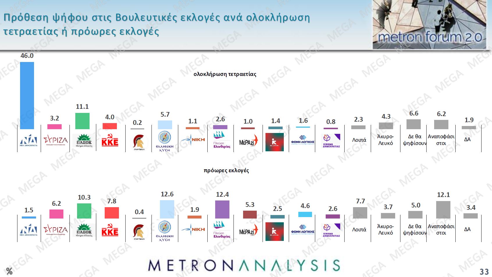 Στην πρόθεση ψήφου η Νέα Δημοκρατία συγκεντρώνει ποσοστό 21,8%, το ΠΑΣΟΚ-ΚΙΝΑΛ 10,5% και ακολουθούν: Ελληνική Λύση 9,2%, Πλεύση Ελευθερίας 7,9%, ΚΚΕ 6,3%, ΣΥΡΙΖΑ-ΠΣ 4,8%, ΜέΡΑ25 3,2%, Φωνή Λογικής 3,2%, Νέα Αριστερά 1,9%, Κίνημα Δημοκρατίας 1,7%, Νίκη 1,5%, Σπαρτιάτες 0,3%. Λοιπά κόμματα δηλώνει ότι θα ψηφίσει το 5,1%, Λευκό – Άκυρο το 4%. Δεν θα ψηφίσει δηλώνει το 6%, ενώ το ποσοστό της αδιευκρίνιστης ψήφου ανέρχεται στο 12,6%.
