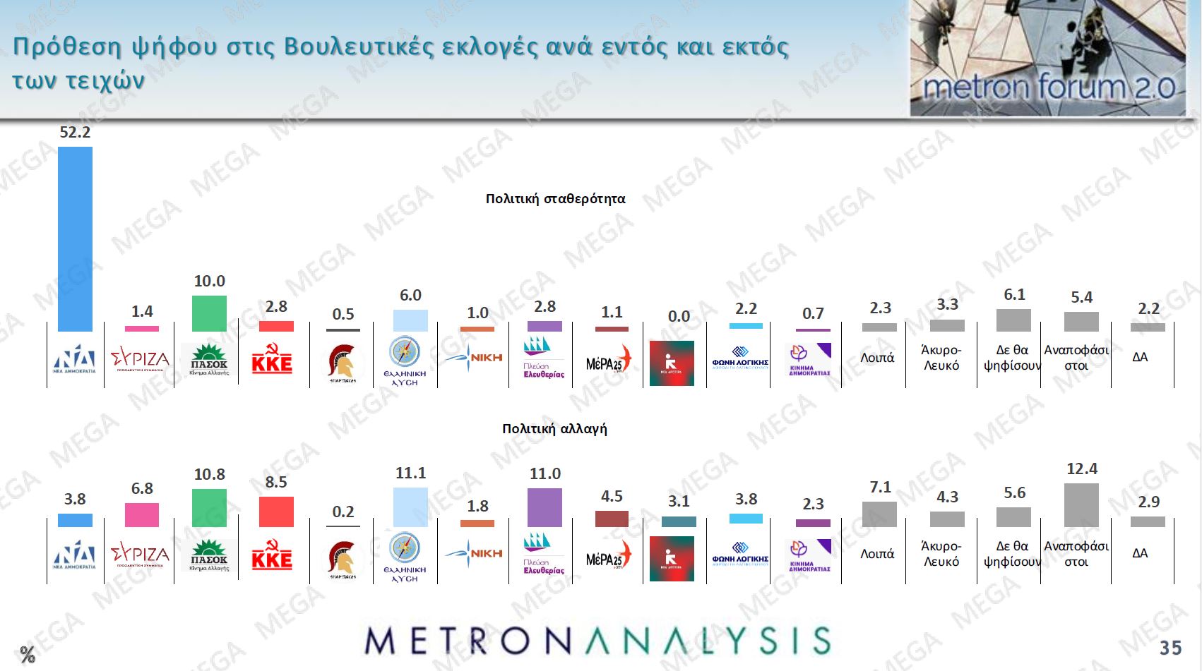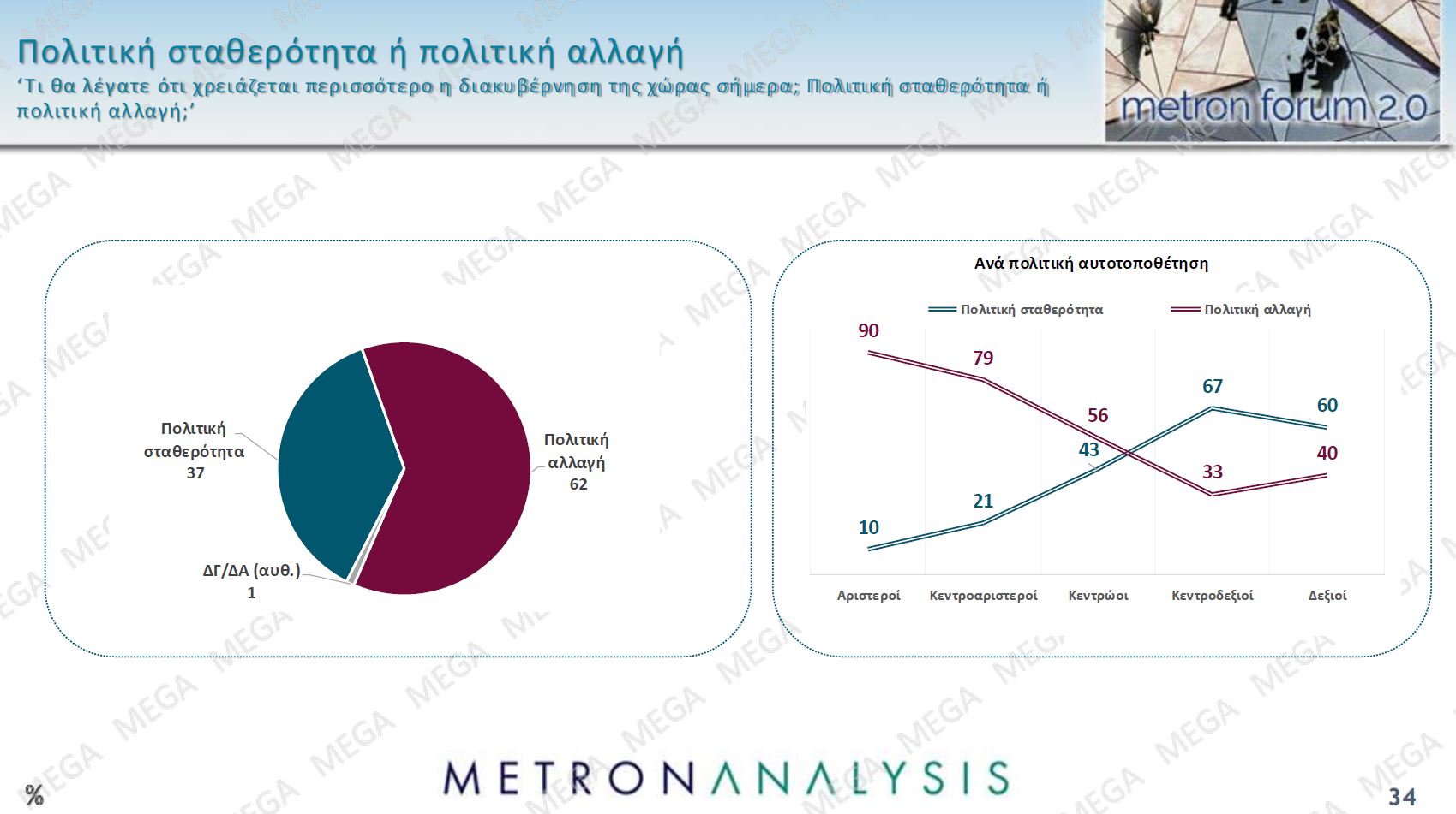 Αντίστοιχα είναι ενδεικτικό ότι το 62% των πολιτών θέλει πολιτική αλλαγή και μόνο το 37% πολιτική σταθερότητα με ισχυρό αίτημα πολιτικής αλλαγής και μεταξύ των κεντροδεξιών και κεντρώων ψηφοφόρων. Αυτό αποτυπώνεται και σε σχέση με την πρόθεση ψήφου με διχασμένους για άλλη μια φορά τους ψηφοφόρους του ΠΑΣΟΚ.